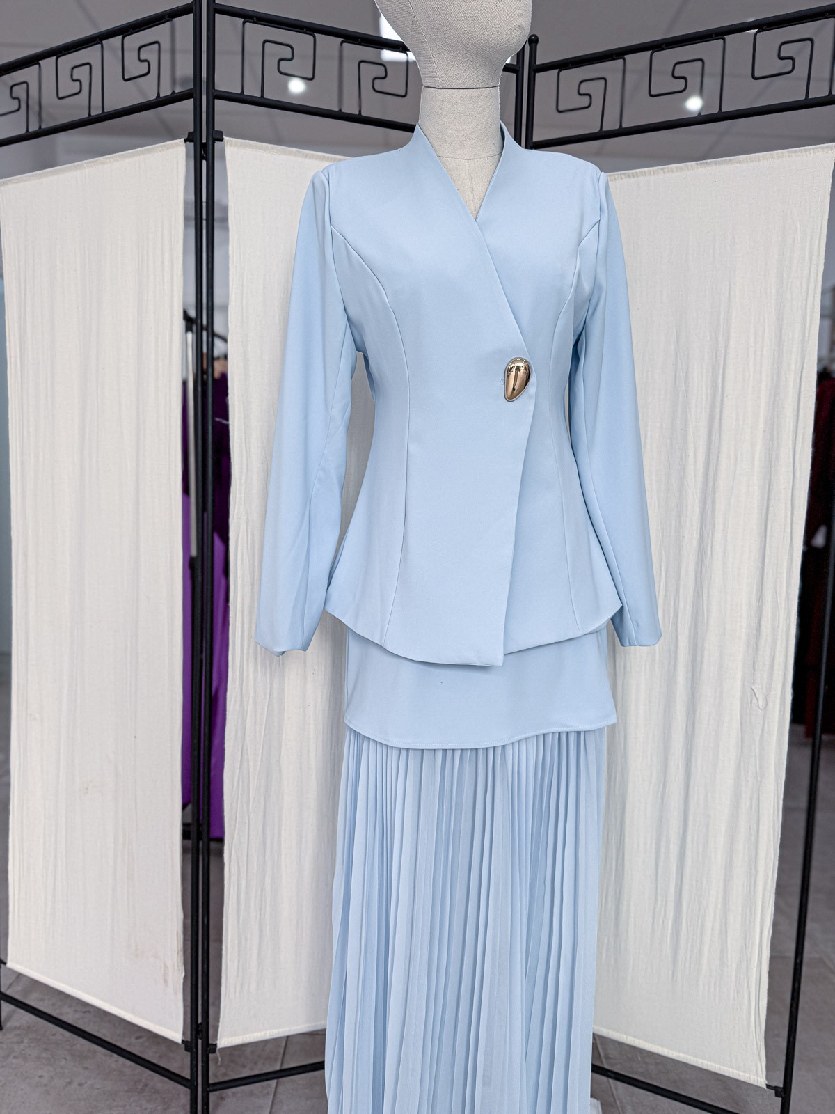 Conjunto de mujer de falda y americana confeccionado en un suave algodón celeste.